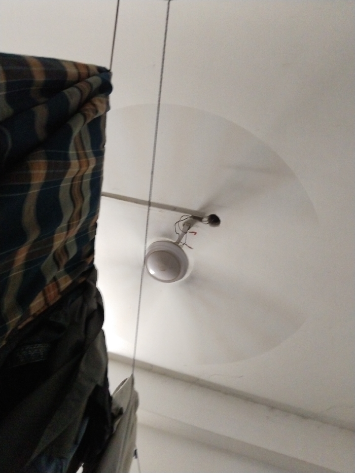 ceiling fan with a white ceiling and a white blade. The fan is located in a building in Dhaka, Bangladesh, with coordinates (latitude: 23.773, longitude: 90.404). The fan is spinning, as indicated by the blurred blades. The ceiling is also white and has a single light fixture. The image is taken from a low angle, looking up at the ceiling fan. There is a patterned fabric hanging in the background, potentially a curtain or a piece of clothing. It is difficult to determine the specific location in Dhaka based solely on these details.