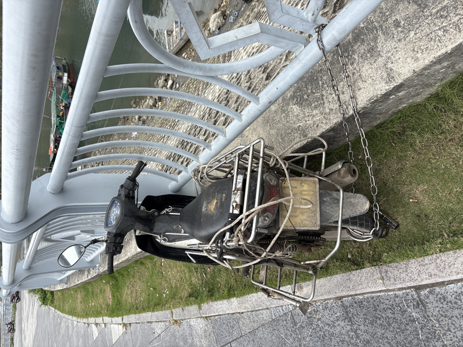 An older, dark gray underbone motorcycle (scooter) is parked on a narrow strip of green grass beside a paved walkway in Ha Tu Ward, Vietnam. The scooter is facing left and angled slightly away from the viewer. Its rear wheel is secured to a light gray metal railing by a heavy chain. The scooter appears worn, with dirt accumulation on its body, seat, and license plate. The black seat shows significant wear, revealing a lighter color underneath. A metal cargo rack is attached to the rear, extensively wrapped with light-colored rope. The yellow rear license plate displays "202" and other partially obscured characters. To the left of the scooter is a dark gray paved pedestrian path. To the right, beyond the grass and a concrete ledge, a body of water is visible. Several small, utilitarian boats, some with green tarpaulins, are present in the water. Debris is scattered along the water's edge below the railing. No individuals are present in the frame.
