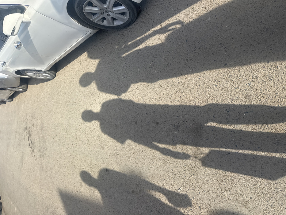 This image presents a sunlit street scene in Ikeja, Nigeria. The primary subjects are the long, distinct shadows of four individuals cast upon a light grey, granular paved surface. The shadow furthest left is partially cropped, indicating a person moving from left to right. The central prominent shadow clearly depicts a person standing or walking, holding a rectangular object, consistent with a bag or package, in their right hand. To the right of this central figure, another human shadow is visible. A fourth shadow, positioned to the far right and partially overlapping the third, shows a person whose shadow also suggests they are holding an elongated object, possibly an umbrella or stick, extending from their right side. Along the right side of the frame, several vehicles are parked in a line. The most prominent is a white sedan, revealing its front passenger wheel, a portion of its side panel, and side mirrors. Behind it, parts of at least two other lighter-colored vehicles (silver or white) are discernible. The shadows' length and clarity indicate a low sun angle, suggesting either early morning or late afternoon. The environment is limited to the paved road and the parked automobiles.