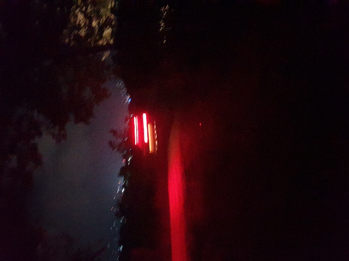 A dark, grainy image reveals streaks of red and amber light, likely captured with motion blur. The blurred lines suggest a vehicle or illuminated structure in motion. A shadowy mass resembling trees or foliage is visible along the left edge, fading into the darkness. The overall scene conveys a sense of speed or instability, possibly taken at night. The light and dark contrasts create an abstract, ambiguous composition.