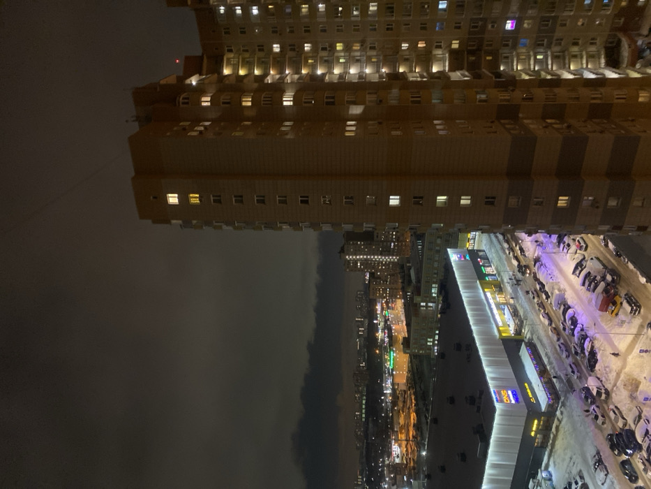 An elevated perspective reveals a city at night, segmented by a dark, undefined area that could be sky or land. A tall residential building with illuminated windows dominates the upper portion, while a commercial structure with a long, lighted facade and an adjacent parking lot filled with vehicles is visible below. Other buildings with illuminated windows and streets with lights can be seen in the distance. The city seems covered in snow.
