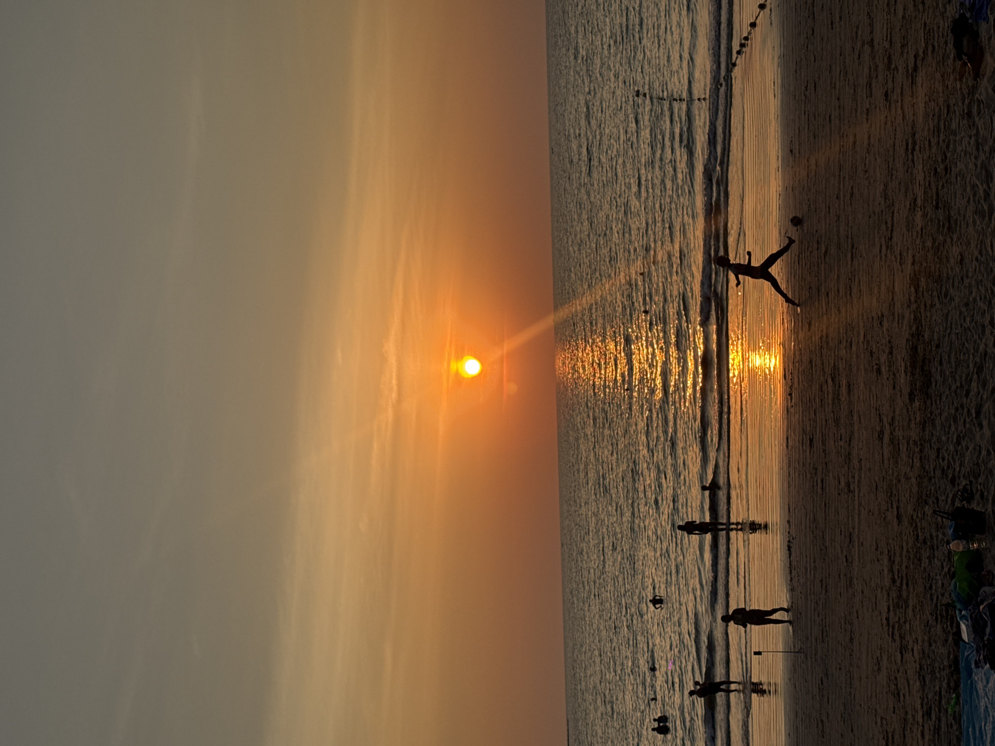 This image depicts a sunset scene at Kamala Beach in Kamala, Thailand, facing west towards the Andaman Sea. The sky transitions from a light grayish-blue at the top to an intense orange-yellow at the horizon. A prominent, bright orange sun is positioned slightly left of center on the horizon, casting a strong, shimmering golden reflection path across the water surface towards the viewer. The sea exhibits gentle waves. Approximately ten individuals are visible, primarily in silhouette. In the mid-ground, a line of dark buoys extends into the water from the right. Several people are in the water, some swimming and others standing partially submerged. On the wet sandy beach in the mid-ground, one person is captured in motion, mid-stride, kicking a football. Two additional silhouetted figures stand near the waterline; one appears to be holding a dark, elongated object. In the lower foreground, on the darker, drier sand, a blue mat or towel, several bags, and a plastic water bottle are visible.
