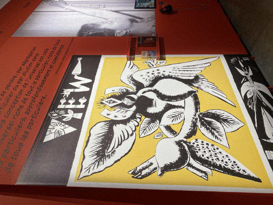 The image features a close-up shot of a display showcasing art and text. On the left, a red panel displays French text, including the words "particuliers", "universel", and "coexistence", attributed to Aimé Césaire. Adjacent to this panel, a yellow background showcases a black and white graphic featuring an abstract, stylized bird motif. To the right, a partially visible monochrome graphic adds further contrast. A clear block rests atop the yellow artwork, adding a three-dimensional element.