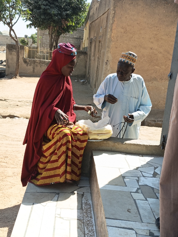In the city of Zango, Nigeria, an outdoor scene unfolds under daylight. A young female, seated on a low concrete structure on the left, wears a red hijab and a red and yellow patterned skirt. She holds small, dark items in her right hand. Next to her on the structure rests a bundle of white material wrapped in clear plastic. An elderly male stands opposite her on the right, clad in a light blue traditional robe and a patterned cap. He holds a strand of dark prayer beads in his left hand, observing the female with his right hand slightly raised. The concrete structure features a patterned tiled surface. The background reveals dirt ground, a small tree, and buildings constructed from what appears to be unpainted concrete or mud plaster. A partial view of a third person's light-colored attire is visible on the far right.