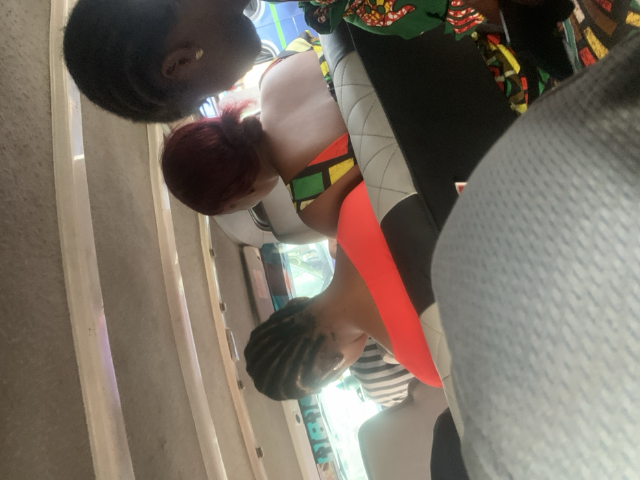 Three people occupy a vehicle, likely a bus. One person's head is visible at the top, showing short, dark hair. Another, with auburn hair pulled back, wears a colorful, patterned top. The third individual wears a striped top with a bright orange strap. The vehicle's interior includes grey seats and a white, ribbed wall with windows. The view is angled upwards.