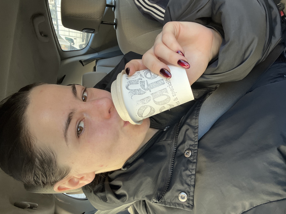 The image depicts a young adult female occupying the front passenger seat of a vehicle in Roubaix, France. She has dark hair, pulled back from her face, and brown eyes, directed towards the camera. Her skin appears clear. She is dressed in a dark, likely black, puffer jacket, identifiable by a visible zipper and snap buttons on the collar. Her left hand, adorned with dark red, glossy, almond-shaped manicured nails, holds a white disposable coffee cup to her lips, indicating an action of drinking. The cup features dark grey text, partially legible as "on! Cafe" and "cafe & specialties." Inside the vehicle, a beige headrest is visible behind the subject to her right. The external environment, seen through a rear window, includes a white commercial van and indistinct urban structures, indicating a daylight setting.