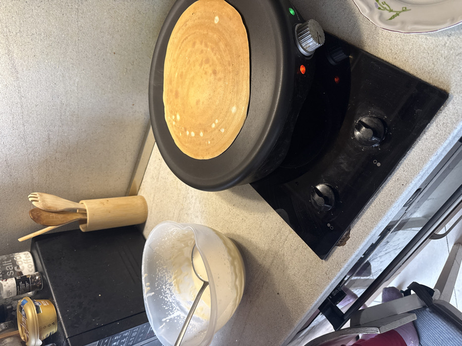 This image depicts a kitchen countertop scene in Sofia, Bulgaria, focusing on crepe preparation