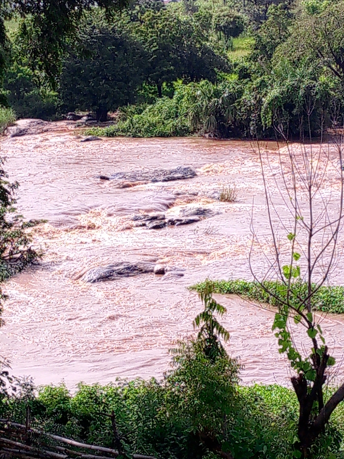 The image depicts a wide, turbid river flowing through a natural environment in Adankolo, Nigeria. The water, a reddish-brown color with visible white foam and ripples, indicative of a strong current, occupies the majority of the frame. Several elongated, dark gray rock formations are partially submerged within the river, creating small rapids. The river banks are densely covered with lush green vegetation, including various trees and bushes. In the background, a thick canopy of green trees forms the horizon. In the foreground, on the right, a mostly bare tree branch with a few new green leaves is visible. A patch of green aquatic plants floats on the water near the bottom right. A partial wooden fence-like structure is visible at the bottom left. No individuals, animals, or man-made structures other than the fence are discernible.