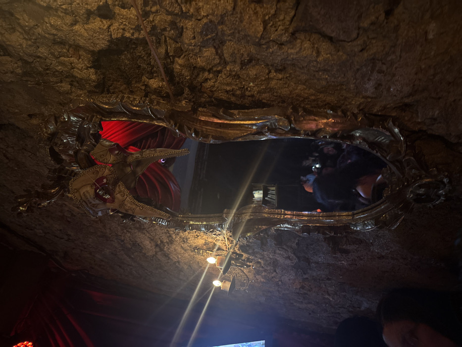 A decorative mirror hangs from a textured, cave-like ceiling. Ornate gold framing surrounds the mirror, with a decorative piece featuring two crocodile heads with red accents attached. The mirror reflects a dark interior space with people. A set of hanging lights adds a modern touch to the scene. Red fabric drapes are visible in the lower left corner and reflected in the mirror.