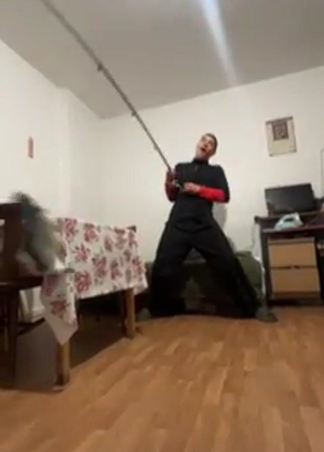 In a medium, static shot, a young man is seen indoors, enthusiastically practicing with a fishing rod, using a large, gray, soft object as a lure. He's dressed in black track pants and a long-sleeved black shirt with red accents. His mouth is open in a wide grin or shout, showing he's engaged in the activity. The background is a typical living room setting, with a floral-patterned tablecloth draped over a wooden table, a green sofa partially visible behind him, and a wooden cabinet holding a small television and an iron. The room's lighting is bright, casting clear shadows on the wooden floor. During the action, the "lure" swings wildly, momentarily obscuring parts of the man's body.