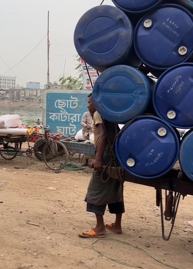two men pushing heavily loaded carts on a dirt road near a river. In the first scene, a man is standing next to a cart loaded with blue plastic barrels, his hand resting on one of the barrels. He wears a brown shirt, a patterned green and brown sarong, and orange sandals. He has short dark hair. In the second scene, another man in a striped t-shirt and colorful sarong is pushing a cart loaded with cardboard boxes. He has short dark hair and is leaning into the cart, using his weight to help push it. The carts are on a dirt road alongside a river. There are other carts and bicycles visible in the background, along with buildings on the opposite side of the river. The sky is overcast.