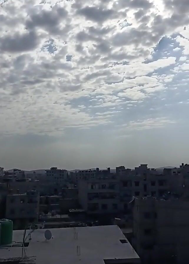 The view is from a high vantage point, most likely a rooftop, looking over a cityscape. The buildings are primarily multi-story residential or commercial structures, mostly gray or light in color. They appear densely packed together. Some rooftops are visible, containing water tanks and what seems to be construction materials. Above the buildings, the sky is largely filled with a patchy layer of white and gray clouds, with small patches of blue sky showing through. There's no evident human activity within the frame. The overall feel of the scene is somewhat muted due to the overcast conditions and the uniformity of the buildings.