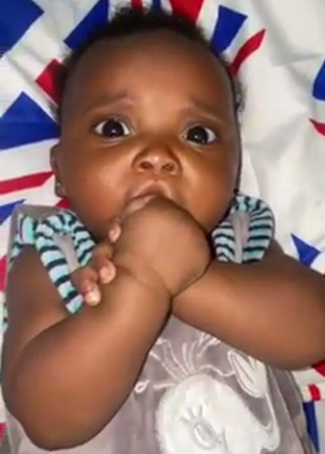 dark-skinned baby lying on their back on a white sheet with a repeating pattern of the Union Jack, the flag of the United Kingdom. The baby is wearing a sleeveless gray dress with a whale or dolphin design on the front. Their hands are clasped near their mouth, and they seem to be chewing on their fingers. They look directly at the camera. The camera is positioned overhead, looking down at the baby. The lighting is indoor and appears to be soft and even. The overall focus is on the baby and their expression.