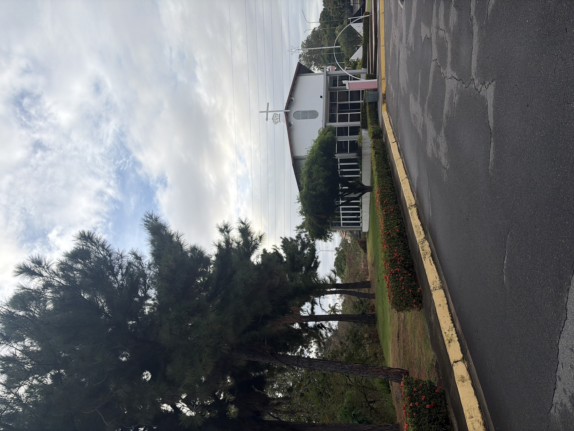 This image captures an outdoor scene in Guayana City, Venezuela, depicting a white building surrounded by vegetation under a partly cloudy sky. In the foreground, a dark asphalt surface, exhibiting numerous cracks and worn patches, occupies the lower portion of the frame. A yellow-painted concrete curb separates the asphalt from a manicured grassy area to its right. Along this curb, a hedge of green bushes densely covered with small red flowers extends horizontally. To the left, several tall, dark green conifer trees with visible trunks stand on a slightly elevated grassy slope. Beyond these trees, additional dense green foliage is visible. Utility lines traverse horizontally across the mid-ground sky, passing above the building. The central subject is a one-story, white building with a dark, sloped roof. Its front facade features multiple large, rectangular window panes with white frames. An arched window is positioned centrally above the main entrance area. At the peak of the roof, a white cross is mounted atop a white, crown-like ornamental structure. To the immediate right of the building, a rectangular pillar, pink in color, stands next to a white, arching decorative structure. Further to the right, a multi-pointed star ornament is visible on top of a pole, with a dark metal gate partially discernible in the background. No individuals, vehicles, or specific actions are observed within the scene. The lighting suggests daylight conditions, potentially overcast or early morning/late afternoon due to the softness of the light and visible cloud cover.