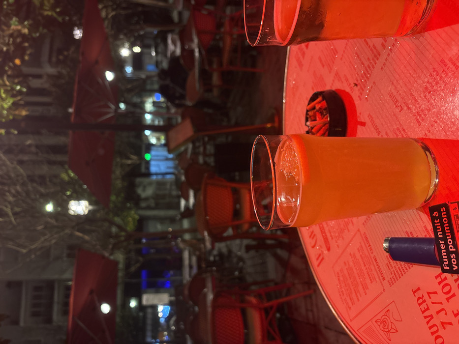 Two glasses filled with orange liquid rest on a round table printed with text, possibly a menu. A black ashtray filled with cigarette butts and a blue lighter are also on the table. The scene is illuminated with red light, casting a warm glow. Red umbrellas and chairs suggest an outdoor café setting at night. Streetlights and building facades are visible in the background, adding depth to the nighttime scene. The text on the table mentions "BOISSONS CHAUDES" and "Fumer nuit à vos poumons."