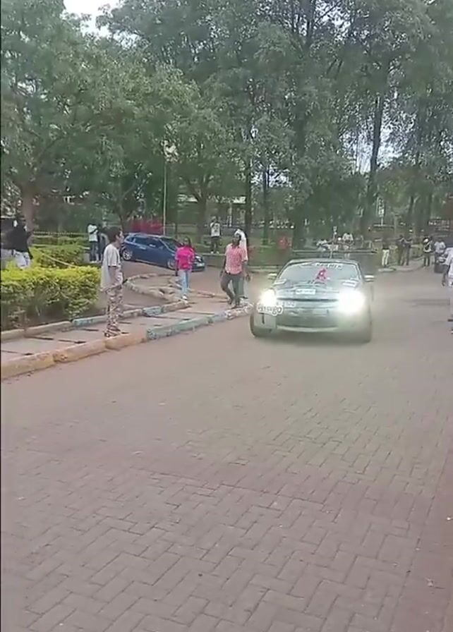 silver Nissan 350Z with a damaged hood driving on a brick road. The car has stickers on it and a rack on the back. The road is surrounded by bushes and trees, and a crowd of people is standing along the edge of the road. The camera follows the car as it drives around the corner.