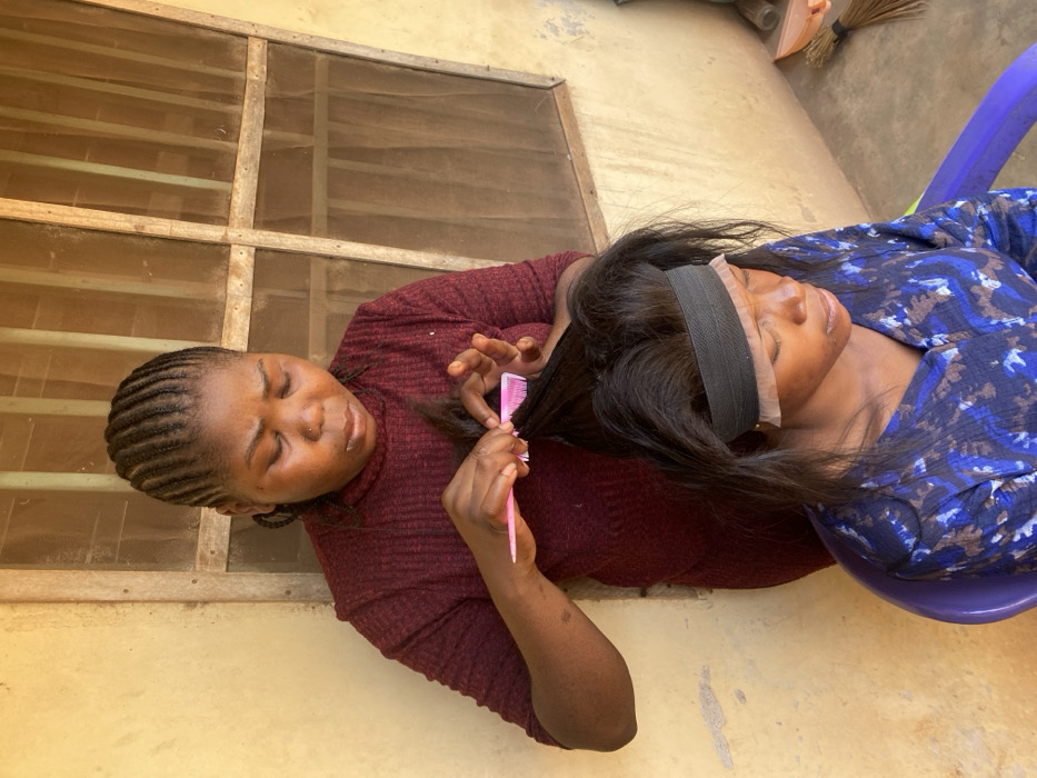 - "In Akwanga, Nigeria, two adult females are engaged in a hair-styling activity outdoors, against a light brown building wall featuring a brown-framed, multi-paned window with a mesh screen" by FM-ZX2IO2, licensed under CC BY 4.0
