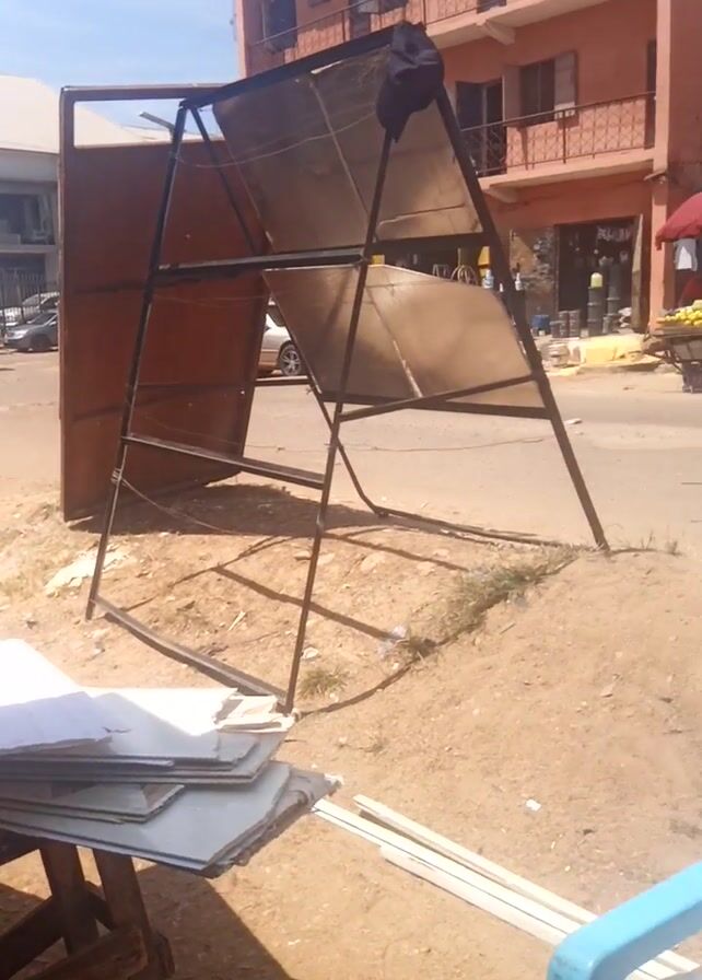 street scene from a partially shaded area that appears to be a work or storage space. The camera is held in a vertical position, providing a view of the street through gaps in construction materials and metal frames. In the foreground, there are stacks of white panels and a dark metal frame structure. Across the street, there is a building with multiple stories and windows. Several vehicles are parked on the side of the road, including a silver sedan and a small tricycle. In one part of the video, a person is seen working on a motorcycle. The sky is visible in the background, appearing bright and clear.