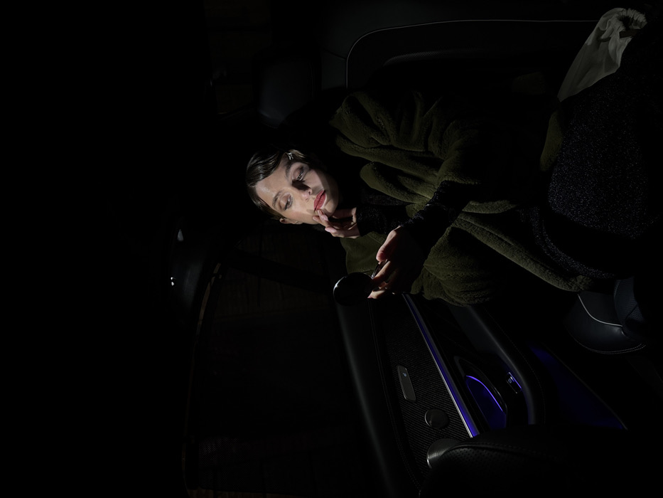 A person sits in a car bathed in dark, shadowy lighting. They wear a large, olive-green coat and dark sleeves. One hand rests gently on their face while the other holds the interior door handle. The car's door is partially visible, featuring sleek carbon fiber detailing and faint blue ambient lighting. The background is largely black, with only hints of the car's interior visible.
