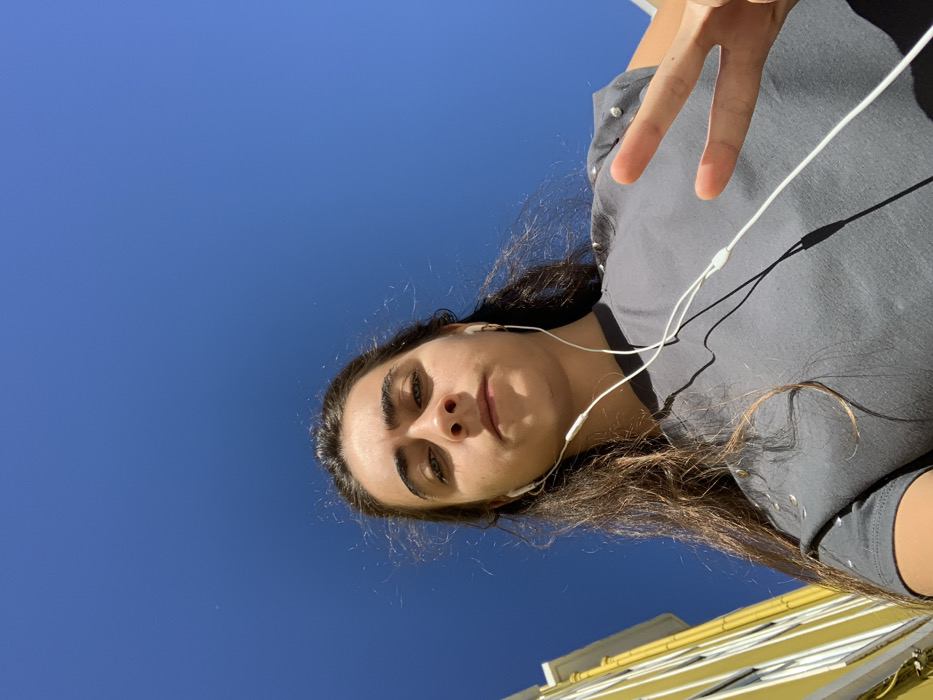 young individual, likely female, from a low-angle perspective against a clear, bright blue sky in Lisbon, Portugal. She possesses long, dark hair and wears a dark grey t-shirt accented with small, reflective studs on the shoulders. White wired earbuds are inserted into her ears, with the connecting cord visible across her chest. She maintains a neutral expression, looking directly forward. Her right hand is raised, forming a V-sign with her index and middle fingers. A portion of a multi-story building with a distinctive yellow facade and visible windows is present on the left side of the frame. The scene is illuminated by strong daylight, casting distinct shadows.