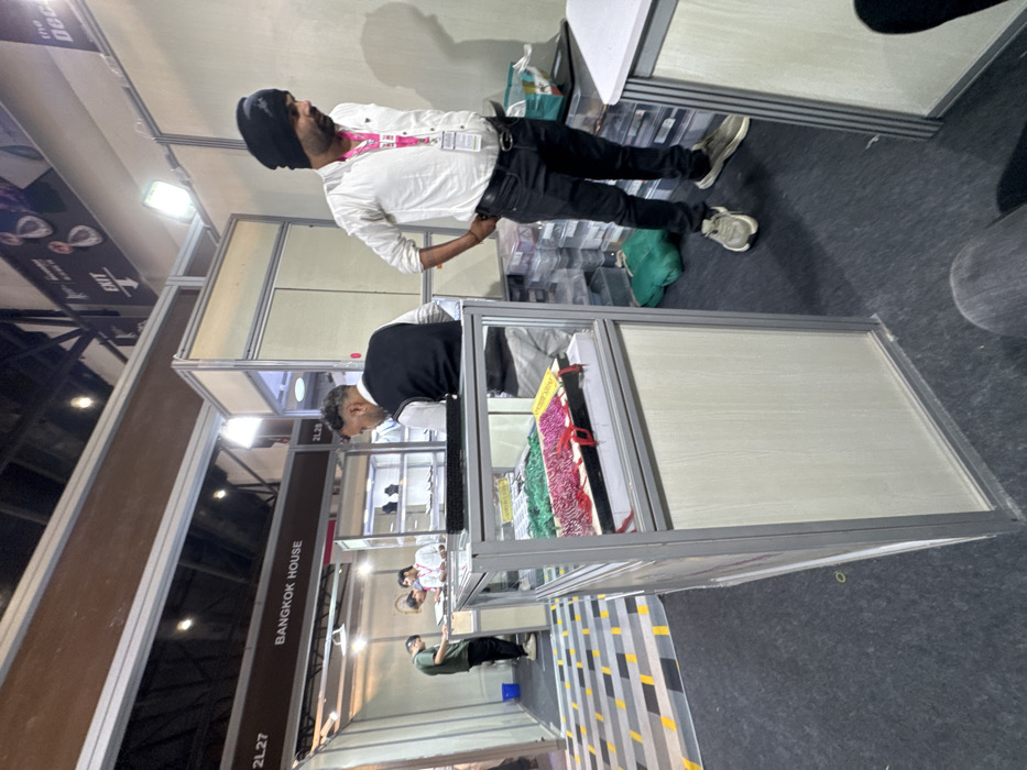 This image captures an indoor exhibition hall scene within an assumed trade show environment in Jaipur Municipal Corporation, India. The setting features multiple booths constructed with aluminum frames and light wood-grain panels, defined by dark grey carpeted flooring. In the foreground right, a male subject stands, facing slightly left with hands on his hips. He wears a white collared shirt, black pants, grey sneakers, and a black beanie, with a pink lanyard and ID badge visible around his neck. To his left, in the midground, another male subject stands behind a glass-topped display case, facing left and away from the camera. He wears a white vest over a light-colored long-sleeve shirt and dark pants. The central display case, constructed of aluminum and glass, showcases multiple trays filled with colorful beaded strands or small gemstones, predominantly green, pink, and red. A white sign labeled "SURVEY FORM" is partially visible on top of this case. Behind it, another glass display case contains various pieces of jewelry, including necklaces on black display stands. Further into the background left, within a booth labeled "BANGKOK HOUSE" with booth number "2L27," two male subjects are visible. One, in a green shirt, faces away from the camera, while the other, in a white shirt with a lanyard, leans over a display counter. A patterned section of flooring with grey, black, and yellow stripes leads into this booth. The background right shows stacked clear plastic storage boxes. An "EXIT" sign with an arrow is visible in the upper right background, alongside a partially visible sign that reads "The Dec...". The ceiling features exposed dark structures and bright overhead artificial lighting. No direct interactions between the subjects are distinctly depicted; they appear to be attending to their respective booths or observing the surroundings.