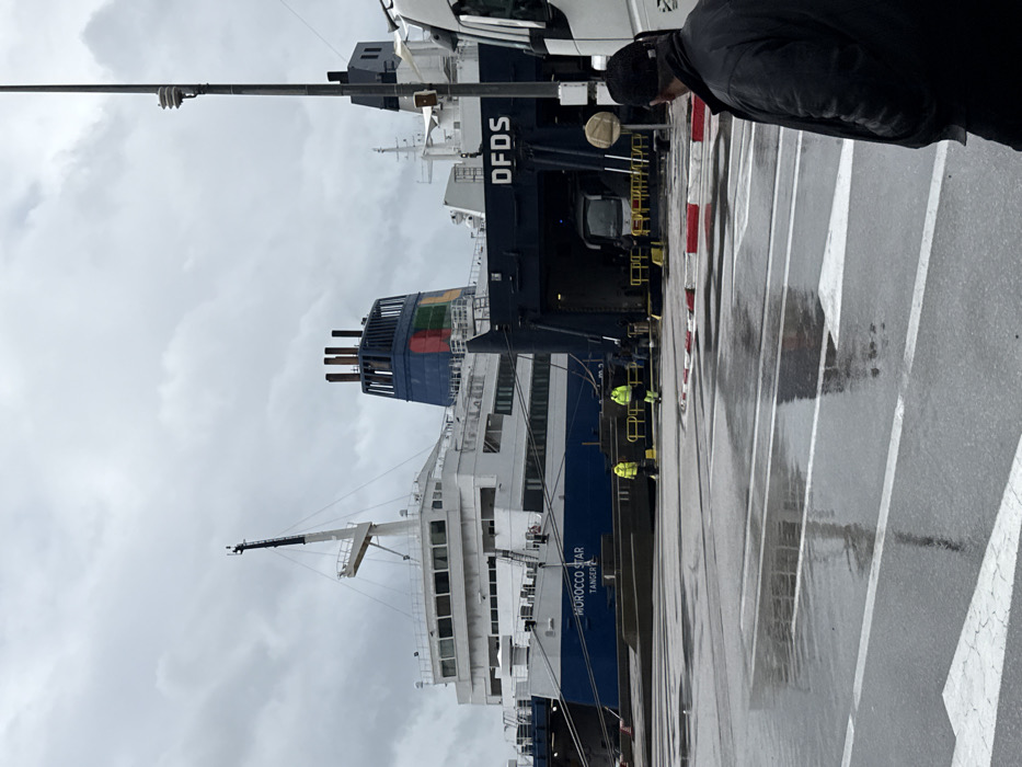 The scene depicts a port terminal in Ksar El Majaz, Morocco, under an overcast sky, with the ground appearing wet from recent precipitation