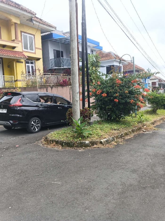 The image depicts a residential street corner in Saisetha, Laos, under an overcast sky. A black Mitsubishi Xpander (license plate DP 2993 AKO) is positioned on the asphalt road, partially adjacent to a grassy median. One individual is visible within the vehicle, seated in the rear driver's side passenger seat. The median is edged with concrete and features a large, dense bush covered in orange flowers, along with smaller green foliage. Two utility poles, one light grey and one dark, stand on the median, supporting multiple overhead wires. In the background, a row of multi-story houses lines the street. The leftmost house is yellow with white window frames and a red tiled roof. The adjacent house is white/grey with a blue roof structure and a dark balcony. Further down the street, additional houses with similar architectural styles and reddish-brown tiled roofs are visible. Concrete and metal railings are present in front of the houses.