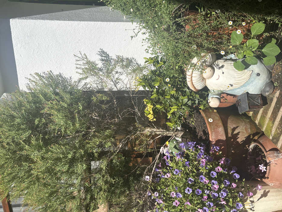 A garden scene with a textured white wall in the background. A lush green bush occupies the left side. Next to it, a planter overflows with greenery, daisies, and a ceramic gnome figure holding a lantern. Another clay pot hosts vibrant purple flowers. The scene is bathed in sunlight, creating strong shadows.