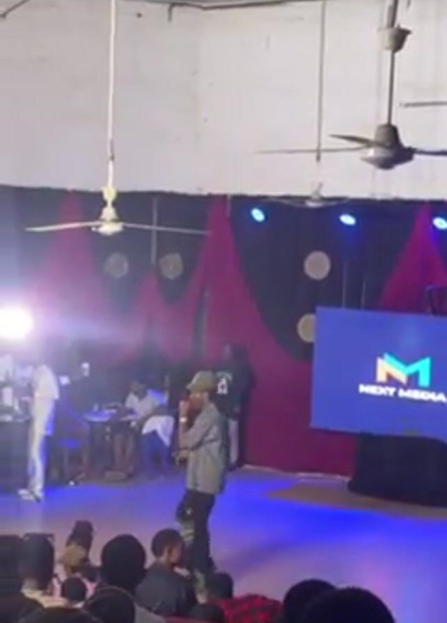 Here is a detailed description of the video: The video shows a man performing on a stage in front of an audience. The performer is wearing a plaid shirt, black pants with green stripes, and a cap. He is holding a microphone and gesturing with his hands. Behind him is a large screen displaying the "NEXT MEDIA" logo. There are also red curtains and round decorative pieces on the back wall. Several people are seated on the stage, while others are in the audience. Overhead, there are ceiling fans. The lighting is bright, with spotlights focused on the performer.