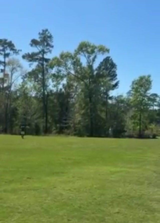 wide, green, grassy field under a clear blue sky. A line of trees is visible along the back edge of the field. Initially, a single figure stands near the left edge of the field, but the person begins walking toward the right, moving further away from the camera. As the person walks, some brick-like structures become visible in the distance toward the right side of the field.