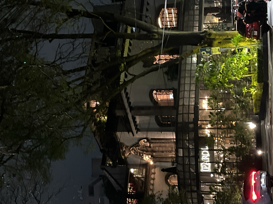 A dimly lit, rotated image shows the exterior of a building at night. The building features decorative stone elements, arched windows with wrought iron, and a glass-enclosed section with string lights. A sign that reads "PAROL" is visible. Trees with bare branches frame the left side, while a parking sign and lush greenery are on the right. A red vehicle light can be seen at the bottom right.