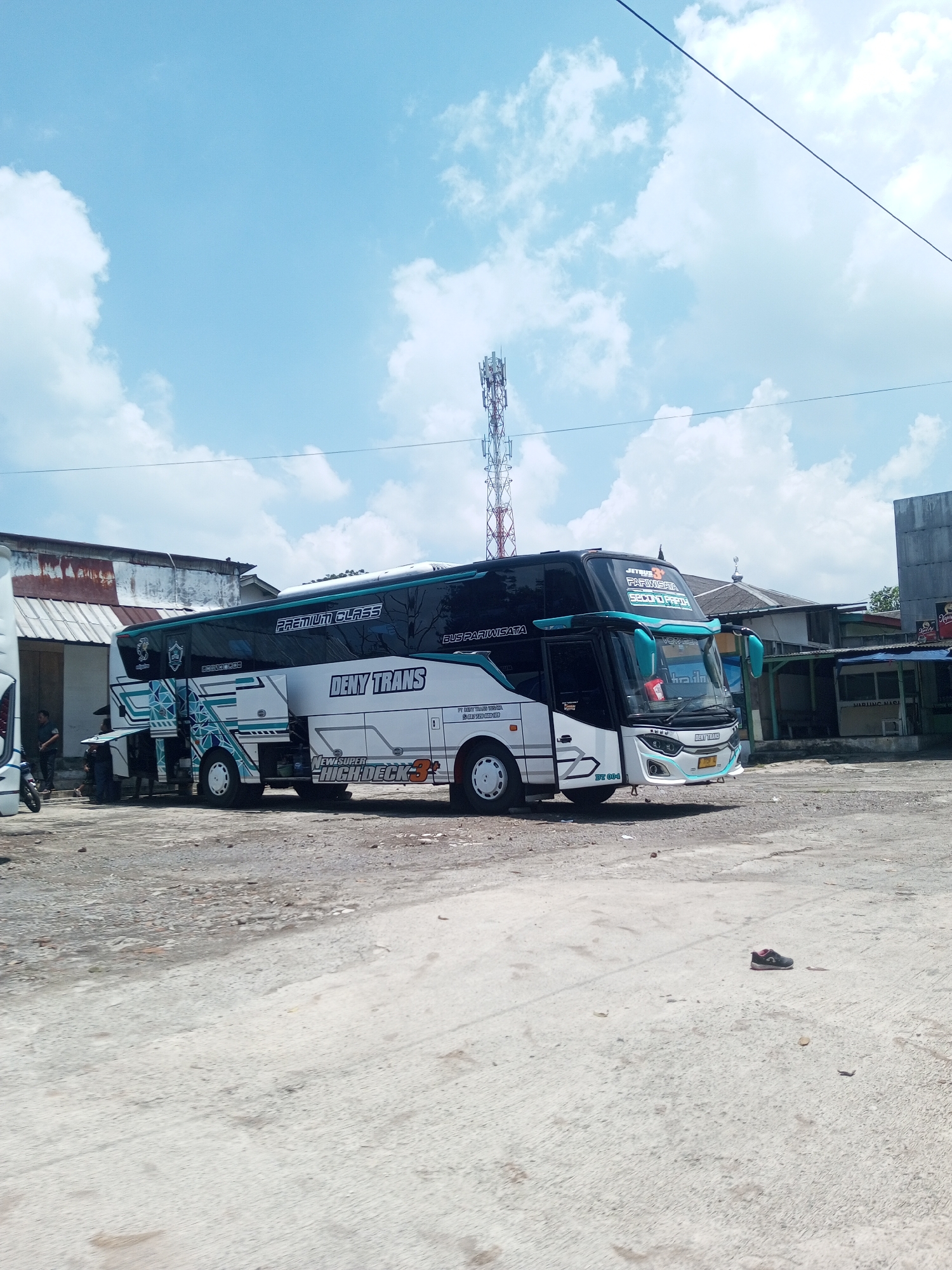 The image depicts a white and black double-decker bus, labeled "Deny Trans" and "Premium Class," parked in a lot. A cell tower rises in the background, under a blue sky with scattered clouds. Several people are visible near the back of the bus, interacting with an open compartment. Buildings with corrugated metal roofs are present behind the bus. A single shoe rests on the concrete lot in the foreground. The location is likely Nawng Hkar, Myanmar, based on the OCR text on the bus.