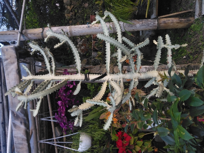 This image depicts a cultivated outdoor garden or nursery scene located in Los Teques, Venezuela. The central subject is a tall, multi-branched succulent plant, possibly a variety of *Euphorbia lactea* or a similar species, exhibiting pale, whitish-green stems with distinct undulated or serrated margins. A black tie secures its main stem. To the left, two white hanging planters are suspended from an overhead canopy structure, which appears to be composed of translucent sheeting supported by beams. One hanging planter contains light green foliage, while another, positioned deeper, displays vibrant dark purple leaves. In the lower-left foreground, a cluster of plants with prominent red leaves is visible, alongside other dark green leafy vegetation. The background features a sloping terrain with additional potted plants and green ground cover. Vertical bamboo poles are present on the right, suggesting a support structure or fencing. No individuals are present.