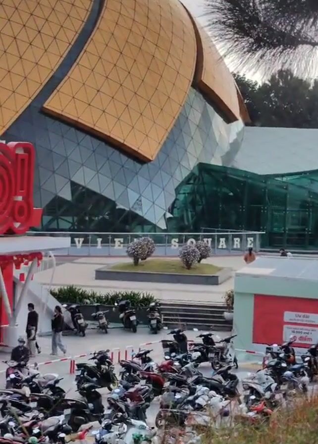 daytime scene of the architectural landmark VIET SQUARE, with a large, lotus-shaped golden dome. In the foreground, there's a parking area densely filled with motorcycles. A red and white "GO!" sign is prominently displayed near an entrance. Several people are seen walking near the entrance of the building. The sky is overcast.
