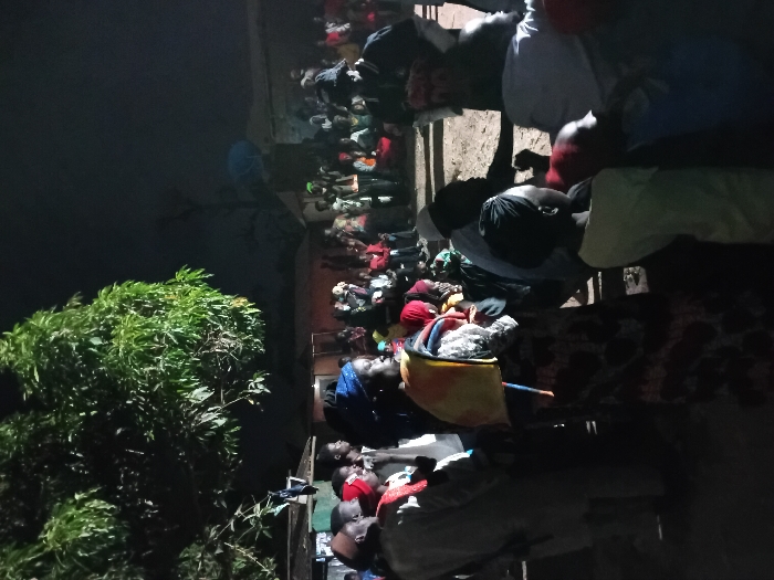 A dimly lit outdoor scene shows a crowd of people gathered along the side of a building. Some individuals are seated while others are standing. Clothing and personal belongings are visible among the group. A large green bush fills the left side of the image. The setting appears to be a gathering, perhaps an outdoor event or waiting area.