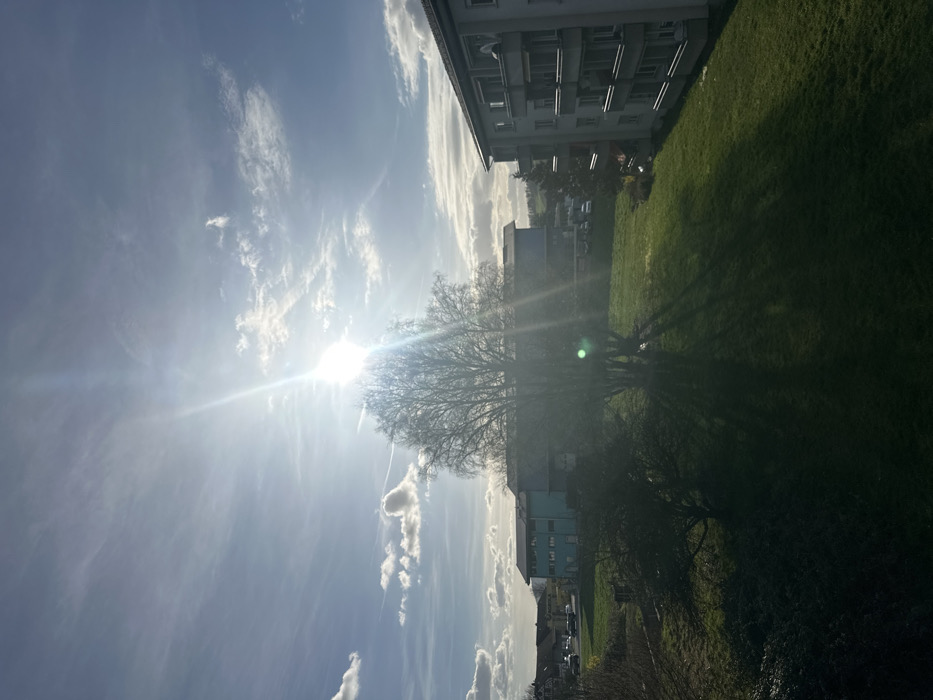 The image captures an outdoor urban/suburban scene in Höri, Switzerland, under bright, direct sunlight, likely late afternoon or early morning. The sky is predominantly clear blue with scattered white, wispy clouds; a faint contrail is visible in the upper-left quadrant. The sun, a prominent bright light source, is positioned in the upper-middle-left of the frame, generating significant lens flare and long, radial light rays. In the mid-ground, a large, deciduous tree with bare branches stands centrally, silhouetted against the sun. Its elongated, dark shadows stretch across a sloping, green grassy area towards the foreground. To the immediate left of the central tree, smaller, darker foliage is present. To the left, behind the central tree, a multi-story light blue-green building with numerous windows is visible. A road with several parked vehicles (cars) runs horizontally in front of this building. To the right, a multi-story light-colored apartment building occupies a significant portion of the frame, featuring multiple balconies with visible railings and at least one satellite dish. The foreground consists of dark, indistinct foliage on the far left and the verdant, partially shadowed grassy lawn extending from the mid-ground. No individuals are visible, and no discernible actions or interactions are occurring. The distant background beyond the buildings reveals rolling terrain under the partly cloudy sky.