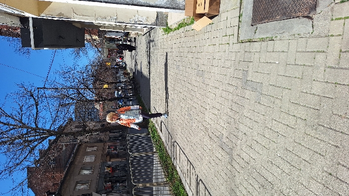 The image depicts a bright, daytime urban scene in Dupnitsa, Bulgaria, captured from a slightly elevated perspective on a paved sidewalk. The foreground features light gray rectangular paving stones arranged in a herringbone pattern, with sparse green vegetation visible between some blocks. On the far right, a rectangular metal utility cover is embedded in the pavement, and two partially open brown cardboard boxes rest against the base of a building. In the midground, a female individual with short, curly blonde hair is walking from the left side of the frame towards the right. She is wearing an orange, white, and light blue jacket, dark trousers, and light blue athletic shoes. Her left foot is forward, and she casts a distinct shadow to her right. To her left, a dark gray metal barrier or fence runs parallel to the sidewalk, separating it from a street. Beyond this barrier, parked vehicles are visible. The background on the left side reveals a street lined with multi-story buildings, exhibiting various architectural styles with visible windows and facades of brick or stucco. Numerous deciduous trees, currently bare of leaves, stand along the street and between the buildings. Overhead wires are faintly discernible against the sky. On the right side, the sidewalk continues past a building with a light-colored, somewhat weathered facade, from which a dark, rectangular awning or sign projects. Further down the sidewalk, several pedestrians are visible in the distance, including one individual pushing a dark object, possibly a cart or stroller. The sky above is clear and bright blue, devoid of clouds.