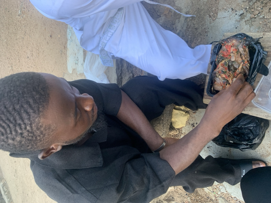 In Okene, Nigeria, an outdoor scene shows two individuals on unpaved ground with concrete elements. A Black male, with a short, wavy haircut and a beard, wearing a dark short-sleeved collared shirt, dark pants, and dark slide sandals, is squatting. He wears a silver-colored bracelet on his left wrist. His right hand is reaching into a black rectangular plastic container holding a prepared meal of fish or seafood stew with visible red peppers and green herbs. Adjacent to this, a clear plastic container lid is on the ground. A black plastic bag is positioned near the food container. To the right, partial view of a second person shows legs clad in white pants and a white garment with a light-colored patterned trim. A white plastic bag and a yellow cloth are visible on the sandy ground in the background. The primary male subject is looking down at the food container.