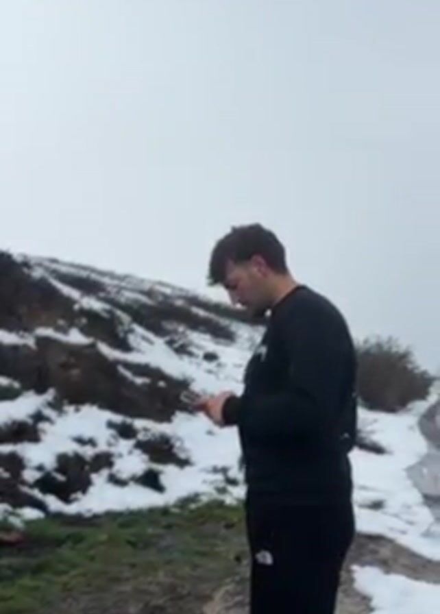 A man stands outside on a partly snowy day looking at his phone. He has brown hair and is wearing a black sweatshirt and black sweatpants. He says, "These guy are crazy." The area around him is dirt and patches of snow. Beyond him is a muddy hill with patches of snow. The sky is white.