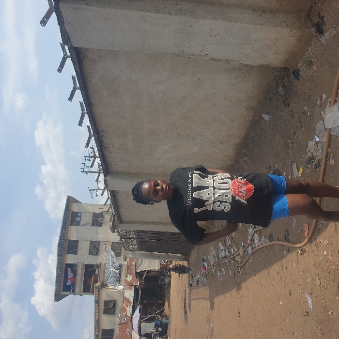 An individual stands on a dirt road in Onitsha, Nigeria, looking downward with a neutral expression