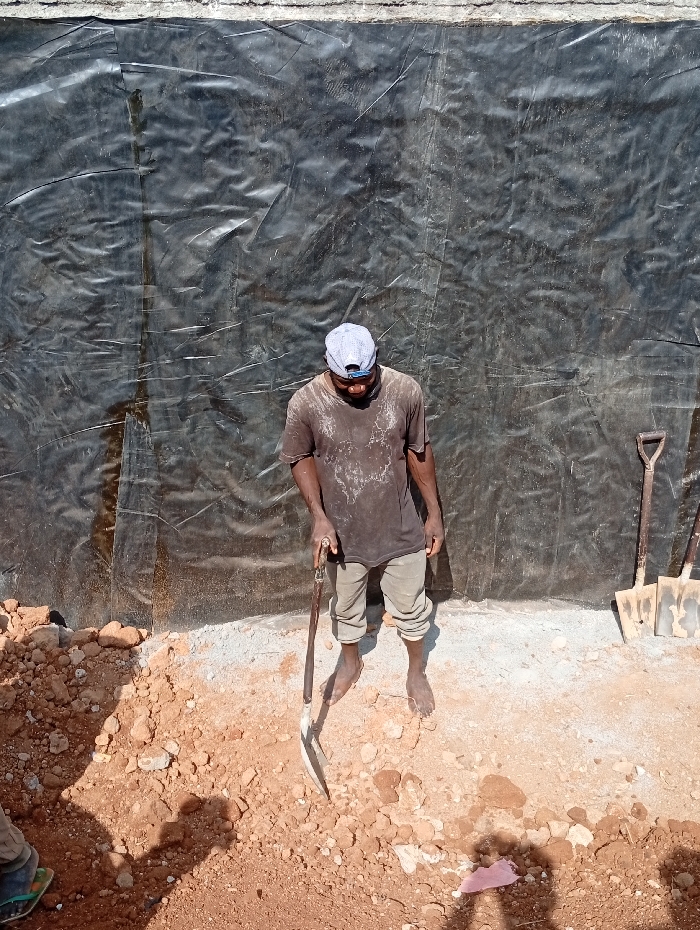 The image depicts an outdoor excavation or construction site in Abuja, Nigeria. A dark-skinned adult male is centrally positioned, facing slightly forward with his head tilted downwards. He wears a light-colored cap, a dark-colored t-shirt stained with light dust or material, and light-colored trousers rolled up to his calves. He is barefoot. In his right hand, he holds a tool resembling a hoe or a small pickaxe with a wooden handle, its blade angled towards the reddish-brown soil beneath his feet. The ground consists of uneven reddish-brown soil mixed with rocks and debris, with a smoother, lighter grey, possibly concrete or sandy, surface extending behind him and to the right. In the far left foreground, a portion of a foot wearing a green sandal is visible. The background features a large, dark, wrinkled plastic sheeting covering a vertical surface, likely a wall or an excavated pit side. Above the plastic sheeting, a horizontal band of rough, light grey material is visible. To the right of the central figure, two shovels with wooden handles lean against the dark plastic sheeting. Strong shadows on the ground indicate direct sunlight.
