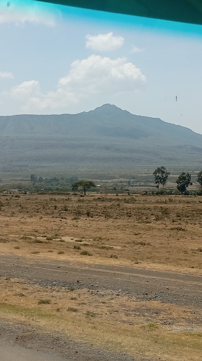 The image depicts a vast, semi-arid landscape within the Hells Gate ward, Kenya, under a clear, bright sky. The scene is viewed from a low vantage point, with a turquoise-tinted strip (likely a vehicle's windshield or visor) visible across the top. In the foreground, a two-track unpaved road, composed of compacted dirt and gravel, runs horizontally across the bottom third of the frame. The immediate surrounding ground is covered in dry, yellowish-brown grass, sparse low-lying scrub, and patches of bare, light-brown earth and small stones. The midground expands into a wide, dry plain. A solitary, mature acacia-like tree with a distinctive flat-topped canopy stands on the left side of this plain. To its right, a cluster of three taller, slender trees with lighter trunks and denser green foliage are visible. Further in the mid-distance, faint outlines of low-lying structures, including what appears to be a light-colored building, are discernible amidst scattered green vegetation, suggesting human presence or a small settlement. The background is dominated by a large, extensive mountain range or elevated plateau, presenting a uniform muted grey-green color, indicative of sparse vegetation or volcanic rock formations. A prominent peak rises towards the center-left of this range. The sky above is a light blue with several scattered white cumulus clouds. A faint, thin, dark vertical streak is present in the upper right portion of the sky. No people or animals are visible in the scene.