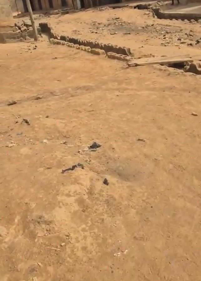 dirt road in a rural area, with modest houses lining the street. The houses appear to be constructed of concrete blocks or a similar material and have corrugated metal roofs. There are some drainage ditches along the side of the road, made of concrete blocks. A person dressed in dark clothing and carrying what seems to be a rifle walks down the street in the middle of the video. The area looks dusty and somewhat impoverished, with trash scattered on the ground. There are also power lines visible overhead.