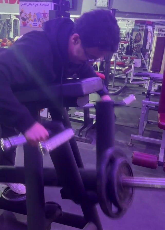 A man wearing a black hoodie, black pants, white sneakers, and glasses is performing a weightlifting exercise in a gym. He is using a machine that supports his torso while he bends over. He is holding a barbell with weights on either side, lifting and lowering it. The gym is filled with various exercise machines, and another person is walking in the background. The lighting in the gym is a mix of white and purple.