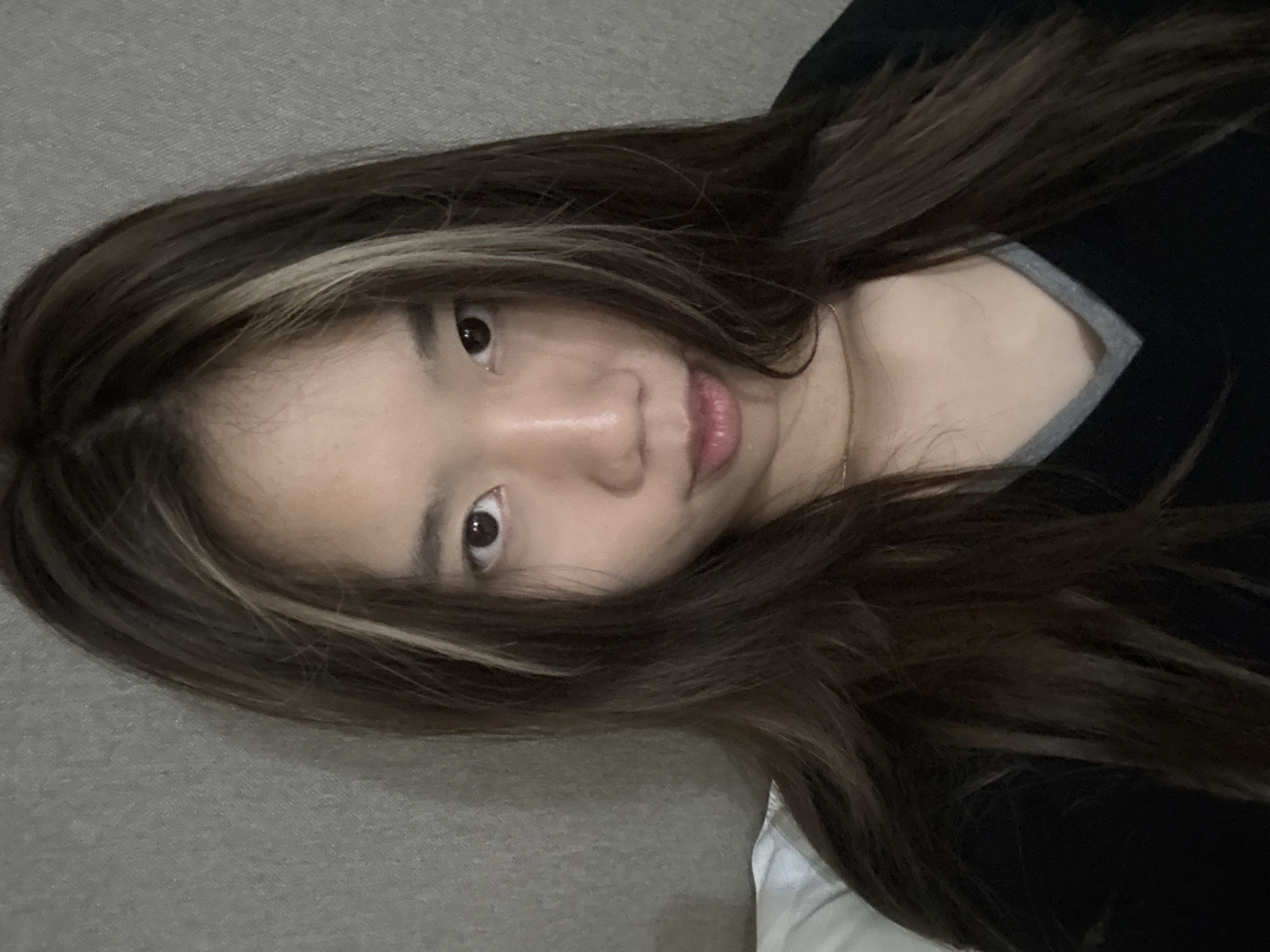 A close-up, rotated selfie of an Asian woman with dark brown hair with light blonde highlights framing her face
