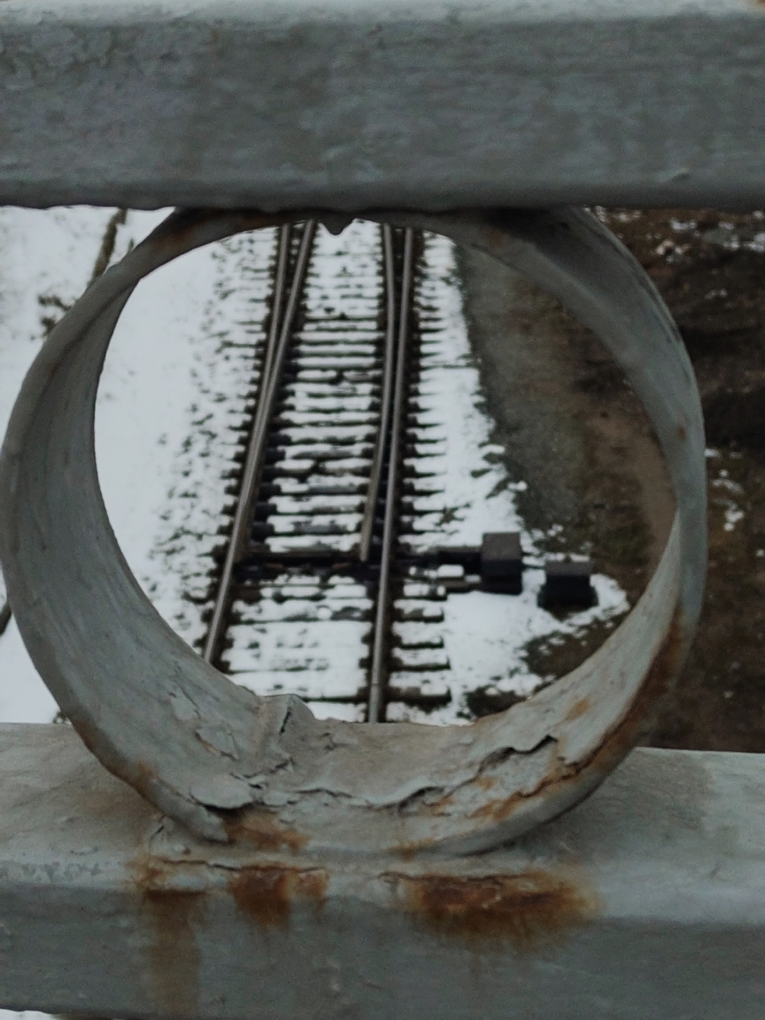 The image depicts a set of parallel railroad tracks running through a snow-covered landscape, viewed through a circular opening in a weathered, gray metal railing. The railing shows signs of rust and damage, with chipped paint and exposed metal. The tracks are partially obscured by snow, with black rectangular objects positioned between the rails. The background beyond the tracks consists of a dark, indistinct area. The location is Unknown, Unknown.