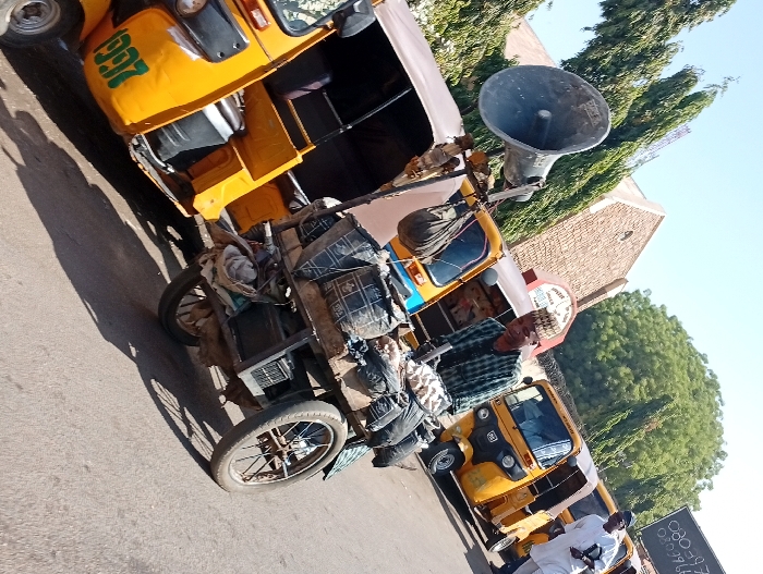 A tilted eye-level shot reveals a yellow tricycle-like vehicle overloaded with bundled items. Above the pile, a large loudspeaker faces upwards. Further down the road, two more similar vehicles are visible. One is parked with a man in traditional attire standing beside it. The background features trees and a building, suggesting a daytime outdoor scene.