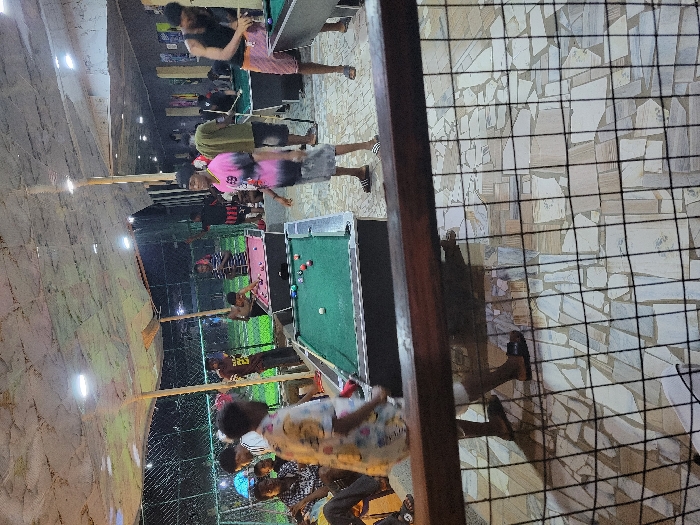 People engage in leisure activities in an indoor-outdoor setting. Several are playing pool or billiards on multiple tables. A few others watch or socialize nearby. The area is lit with overhead lights, creating a casual atmosphere. Part of the scene is viewed through a wire fence.