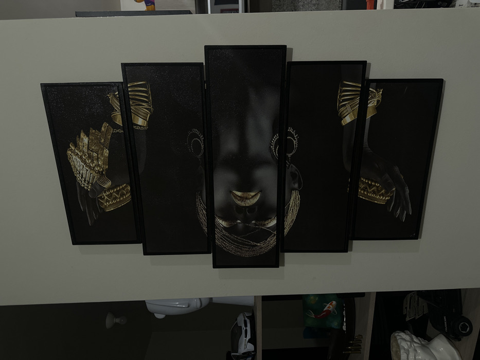 This image captures an indoor scene, likely a residential or commercial interior. The exact location in Cerro Prieto, Mexico, is not visually discernable from the image data. The primary subject is a vertical arrangement of five distinct, horizontally oriented rectangular canvas prints, each framed in black, mounted on a light-colored wall. These prints are staggered, creating a fragmented, composite portrait of an individual adorned with gold. From top to bottom, the depicted elements are: 1. The upper part of a head, featuring an elaborate golden headdress or hair ornament, and the top portion of a hand with golden jewelry. 2. A hand displaying multiple golden bangles or a large cuff. 3. A profile view of a face with closed eyes, golden-painted lips, braided hair interwoven with golden threads, and a prominent golden hoop earring. 4. The lower facial region, neck, and shoulder area, also featuring braided hair with golden accents and another golden hoop earring. 5. A hand exhibiting ornate golden bracelets or a cuff. The artwork utilizes a predominantly dark background with high-contrast golden details on the subject's skin, hair, and jewelry. To the immediate left of the art installation, a dark-colored open shelving unit is partially visible. On the top shelf, a white miniature model car, identifiable as a BMW i8, is positioned next to a white, abstract, stylized head sculpture. The middle shelf holds a small rectangular painting depicting a red and white Koi fish against a dark background, alongside a cluster of approximately six small, metallic, cylindrical objects, possibly bullet casings. On the bottom shelf, a white ceramic bust or planter is placed next to a dark-colored miniature toy vehicle, resembling a Jeep Wrangler Rubicon. Further to the left, a dimly lit architectural opening, possibly a doorway or archway, is visible, with a ceiling light fixture hanging within that space. The ambient lighting throughout the visible room segment appears subdued.