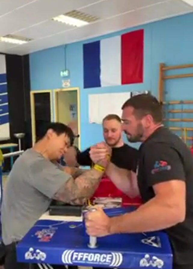 Two men are arm wrestling on a blue arm wrestling table with the words FFORCE and logo printed on it. One man is wearing a grey shirt and has a tattoo on his arm. The other man is wearing a black shirt. A third man is standing between them acting as a referee. There is a French flag on the wall behind them. The room appears to be a gym. The two men struggle, and the man in the black shirt eventually wins.